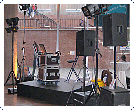 Die Tonanlage kann im Baukastenprinzip von der Kleinst-Veranstaltung bis zum großen Ballsaal aufgerüstet werden. Die maximale Leistung beträgt 6.800 VA RMS ohne Zumietung (kaum zu glauben, aber die Anlage in Woodstock hatte deutlich weniger Leistung …) Diese verteilt sich auf bis zu 6 Bass-Boxen und 6 Lautsprecher-Säulen von HK-Audio elements.